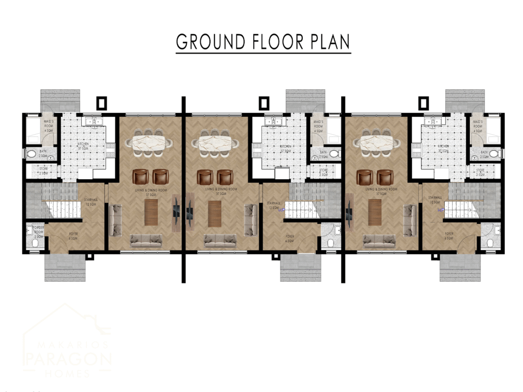 Each unit features a spacious living and dining area, modern kitchen, guest room, staff BQ, and three en-suite bedrooms with a master suite and family lounge.