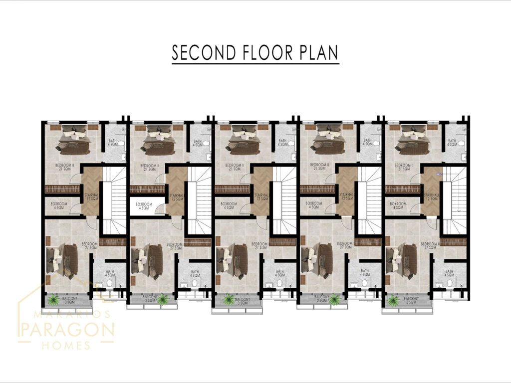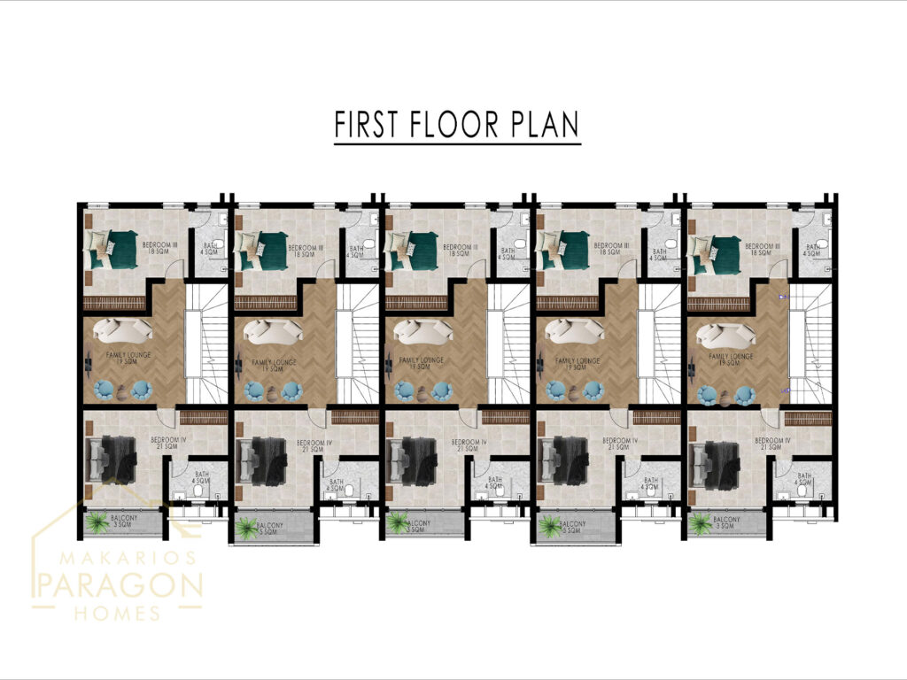 Each terrace offers spacious living areas, fitted kitchen, guest room + BQ, and four en-suite bedrooms including a master suite with lounge and balcony.