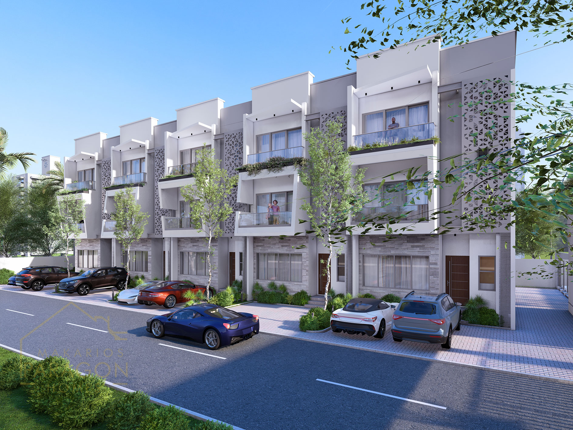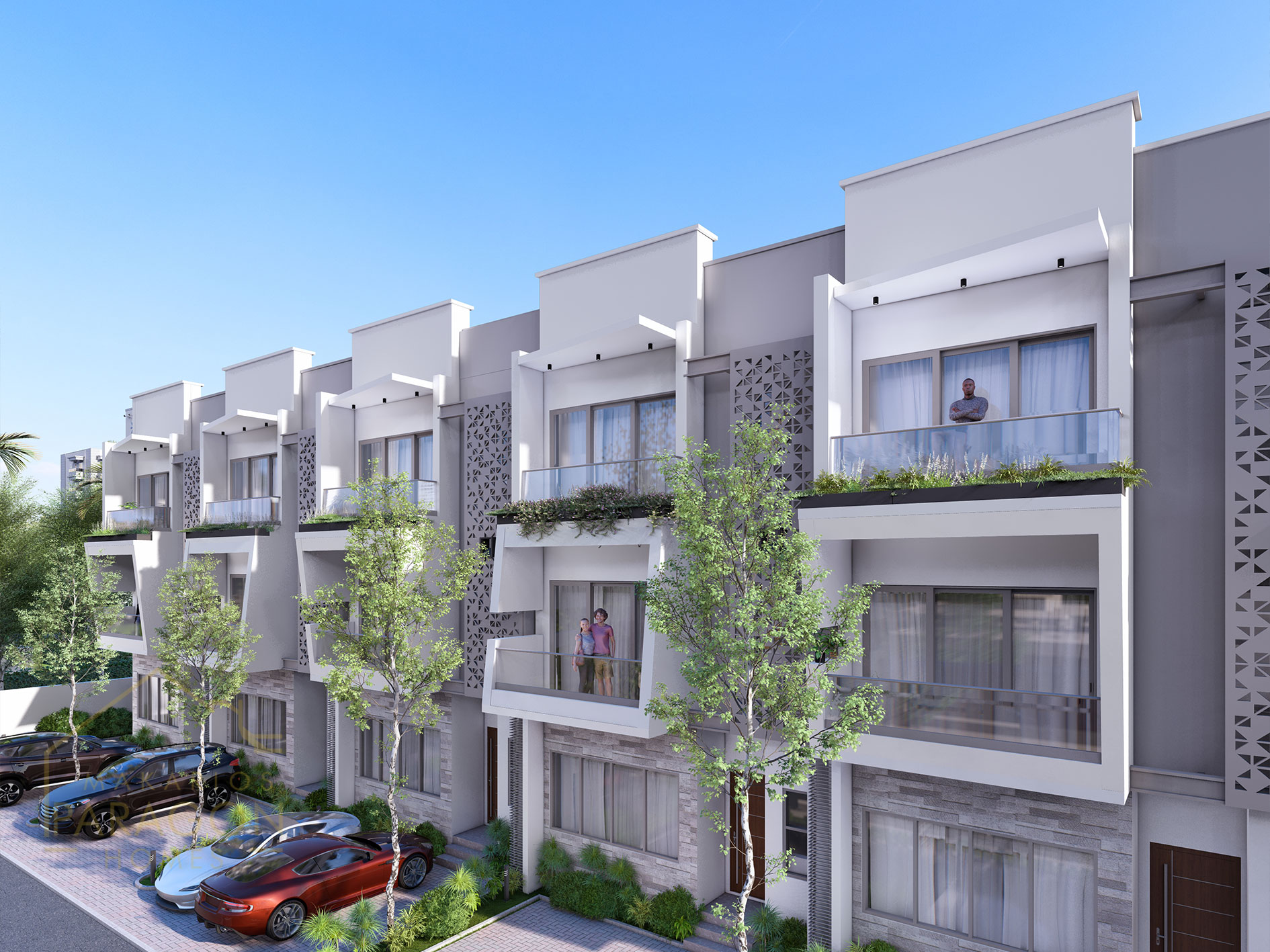 Each terrace offers spacious living areas, fitted kitchen, guest room + BQ, and four en-suite bedrooms including a master suite with lounge and balcony.